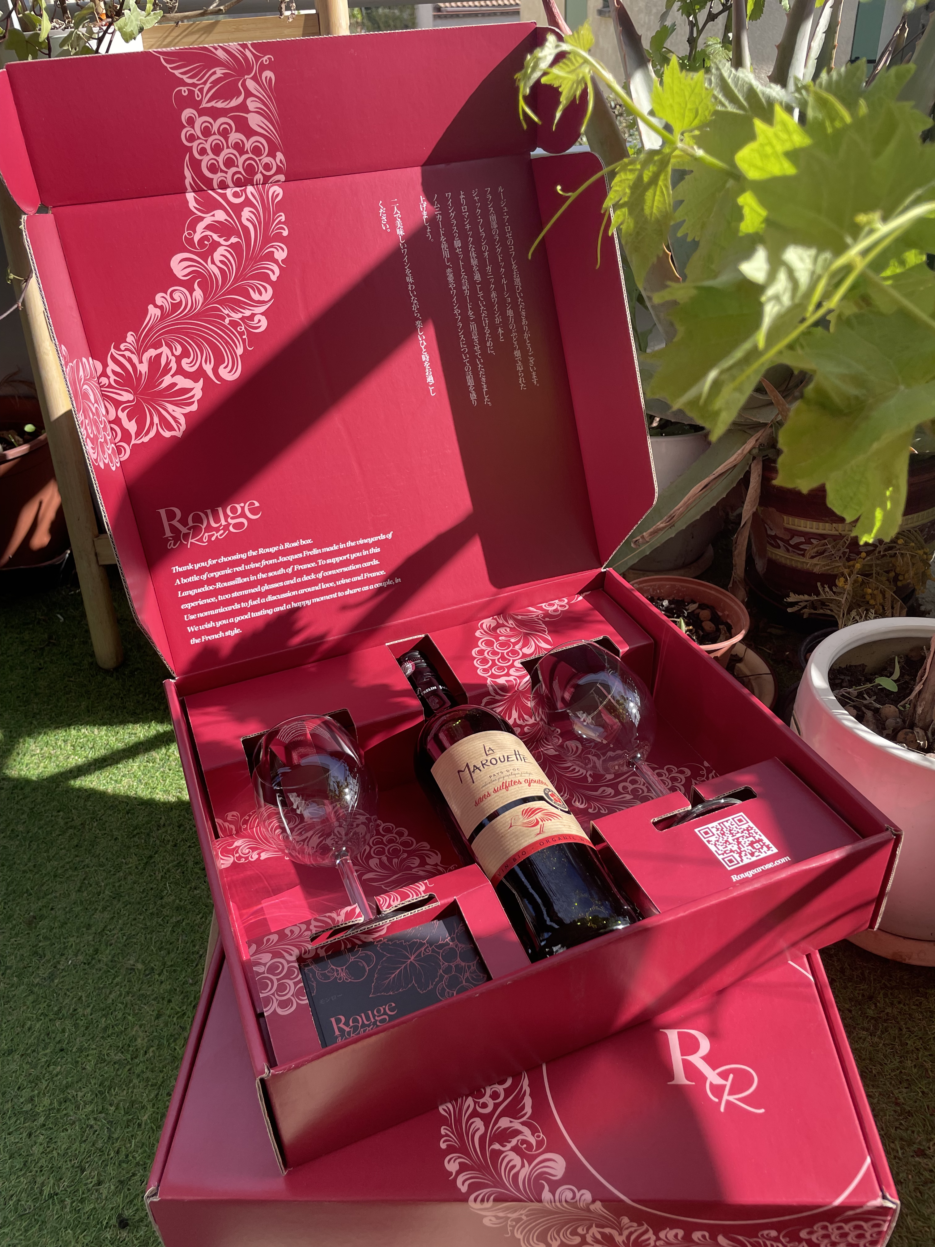 Les coffrets Rouge à Rosé ont été imaginé pour créer une expérience à deux autour d’une bouteille de vin française. Pour vous accompagner dans ce moment romantique, nous incluons dans chaque coffret une bouteille de vin rouge, blanc ou rosé, deux verres à pieds et un jeu de carte de conversation mêlant mots doux dans la langue française et questions pour se découvrir à deux. Ces coffrets sont pensés pour accompagner le couple dans ses moments spéciaux, fêtes, anniversaires ou autre occasions à célébrer à deux.